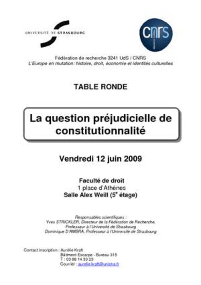 La question préjudicielle de constitutionnalité 12 juin 2009Responsables scientifiques :Yves Strickler et Dominique d'AmbraTéléchargez le programme de la table ronde (44,3 Ko)