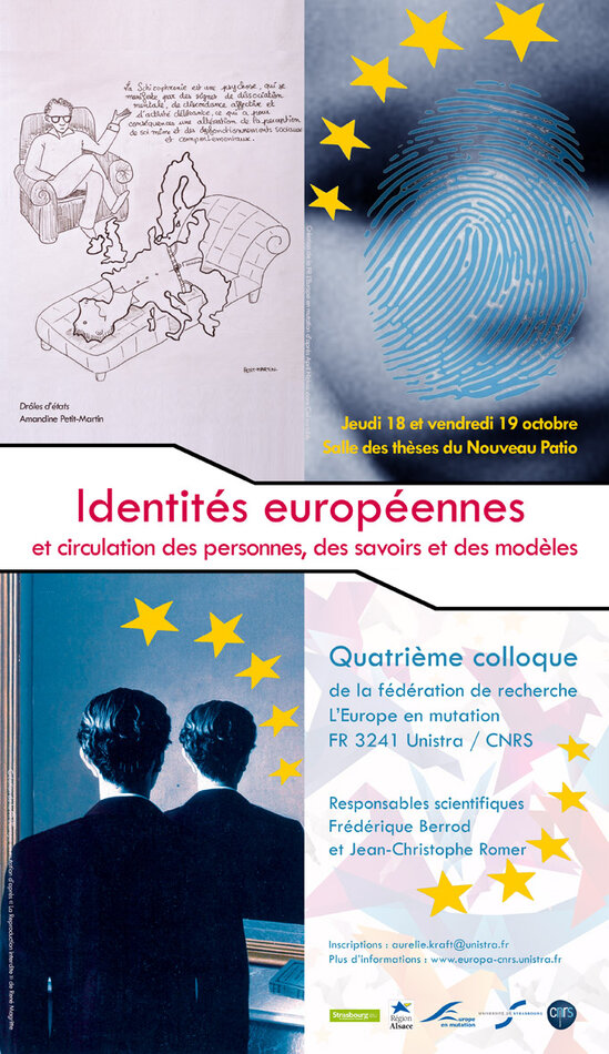 "La Schizophrénie est une psychose, qui se manifeste par des signes de dissociation mentale, de discordance affective et d'activité délirante, ce qui a pour conséquence une altération de la perception de soi-même et des dysfonctionnements sociaux et comportementaux" (Légende de la caricature intitulée "Drôles d'états", par Amandine Petit-Martin[1]). Choisie pour composer l'affiche de la manifestation, cette caricature, en étendant l'Union européenne sur le divan, met en exergue la difficulté à penser l'Europe comme vecteur d'une identité collective, sans penser, au préalable ou en parallèle, la question des identités nationales, voire locales.