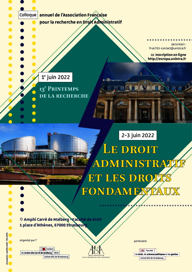L'Institut de Recherches Carré de Malberg (IRCM) accueille le colloque annuel de l'AFDA (Association Française pour la recherche en Droit Administratif) les 1er, 2 et 3 juin prochains, dans l'amphithéâtre Carré de Malberg de la Faculté de droit, de sciences politiques et de gestion, et/ou en visioconférence.